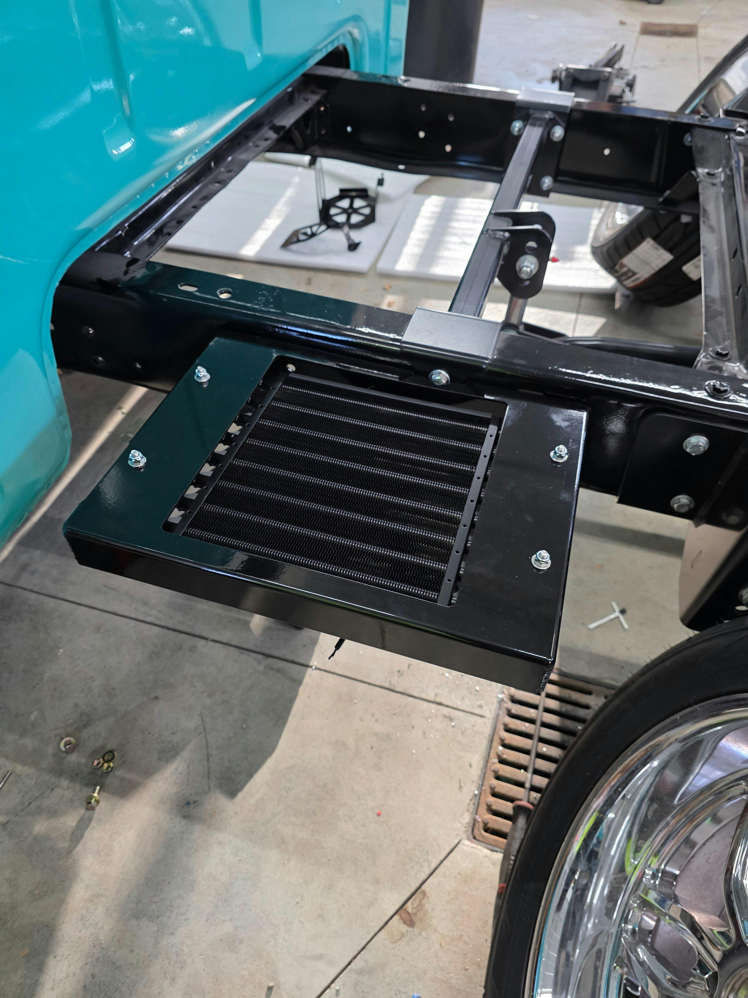 Really like the transmission cooler mount from FF Garage. The fit was excellent and with it powdercoated it blends into the underside beautifully.